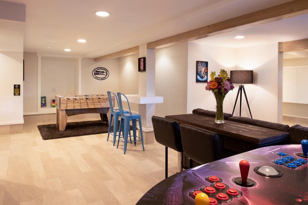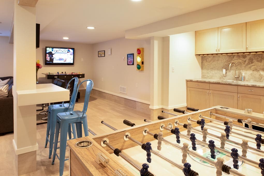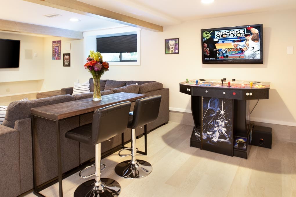 The basement layout remains essentially the same. Two of the walls were enhanced with the addition of storage cabinets. A small table was added to a freestanding support beam that had to remain in the room. The table adds extra seating and better aesthetics to that part of the basement. A new granite countertop and backsplash updated the kitchenette along the back wall of the room. The granite countertop features a unique matte leather finish. Additional can lighting and trim were installed throughout, and the soft greige paint finish that the J & M Remodel team applied to the walls was light enough to brighten and warm the feel of the basement. Finally, the placement of the furniture and games in the room completed this excellent retreat suitable for all ages.